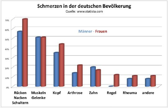 Schmerzen sind in Deutschland sehr weit verbreitet. Nach einer Befragung von 1500 Personen im Alter von über 14 hatten etwa 64% der Befragten Rücken-, Nacken- oder Schulterschmerzen, auf Muskel- und Gelenkschmerzen entfielen 51%, unter Kopfschmerzen litten ca. 38%, Arthrose war bei etwa 18% schmerzhaft, unter Zahnschmerzen litten ca. 18%, 12% der befragten Frauen hatten Regelschmerzen und auf Rheuma und andere Ursachen entfielen je etwa 10%.